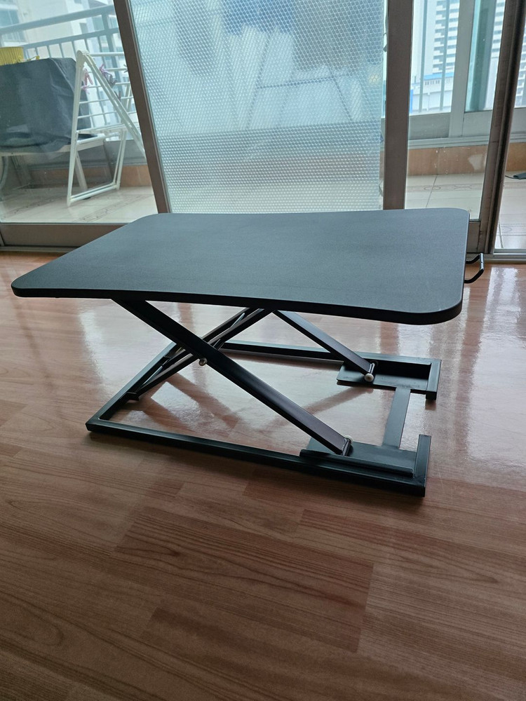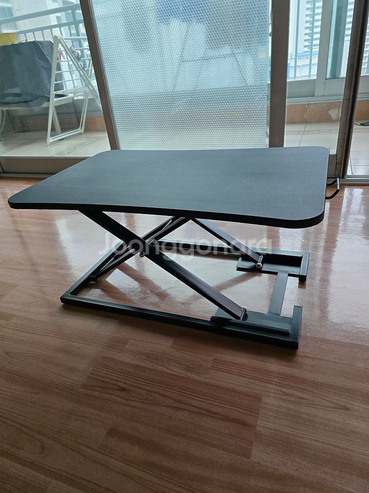 높이 조절이 가능한 스탠딩 데스크예요. 사용감은 있지만 기능상 문제없이 잘 작동합니다. 책상 위에 올려서 사용하거나 독서용으로도 좋아요! 가로 75cm, 세로 45cm, 높이 35cm정도 입니다. 자재는 모두 철재입니다