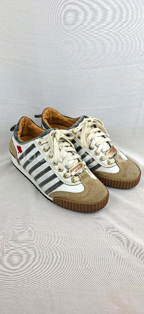 ☆상점에 다른 상품도 구경오세요. 2개 이상 구매시 에눌! ☆사진을 터치하시면 확대해서 보실 수 있습 니다. ☆디스퀘어드2 스니커즈, 사이즈 40반, 260 mm입니다. 스니커즈 외부는 가죽이며, 마 지막 사진 보시면 빈티지스러운 흔적 있습 니다. 내부 가죽 깔창 상태도 앞 부분 흔적 정도만 있지만 깨끗합니다. 오른쪽 앞 코는 깨끗한데 왼쪽 앞 코 부분 미세한 오염이 있 습니다. 밑창은 뒷 부분으로 약간 닳음 있고 스니커즈 혓바닥상단, 입구 테두리, 뒷부분 물빠짐 있습니다. 바로 신으시게 세탁했으며 스니커즈 상태 감안하여 가격 올립니다.