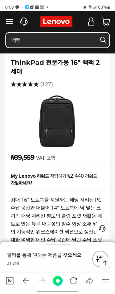 Lenovo ThinkPad 16인치 백팩 2세대 새상품입니다 16인치 노트북까지 수납 가능하고, 14인치 노트북을 위한 별도 슬립 포켓도 있어요 재활용 페트 소재로 만들어졌고, 생활 방수도 됩니다 정가는 89,559원이에요