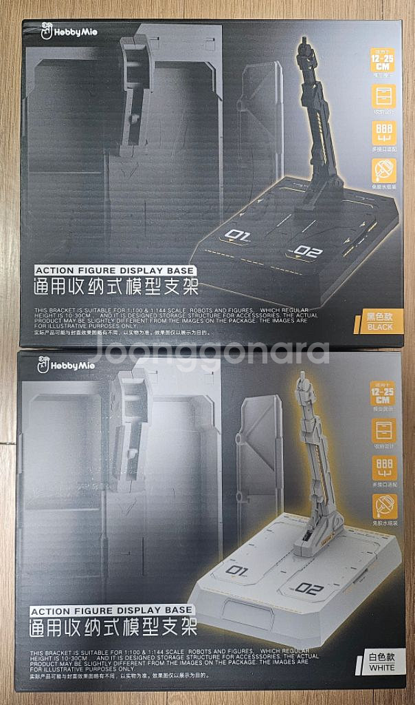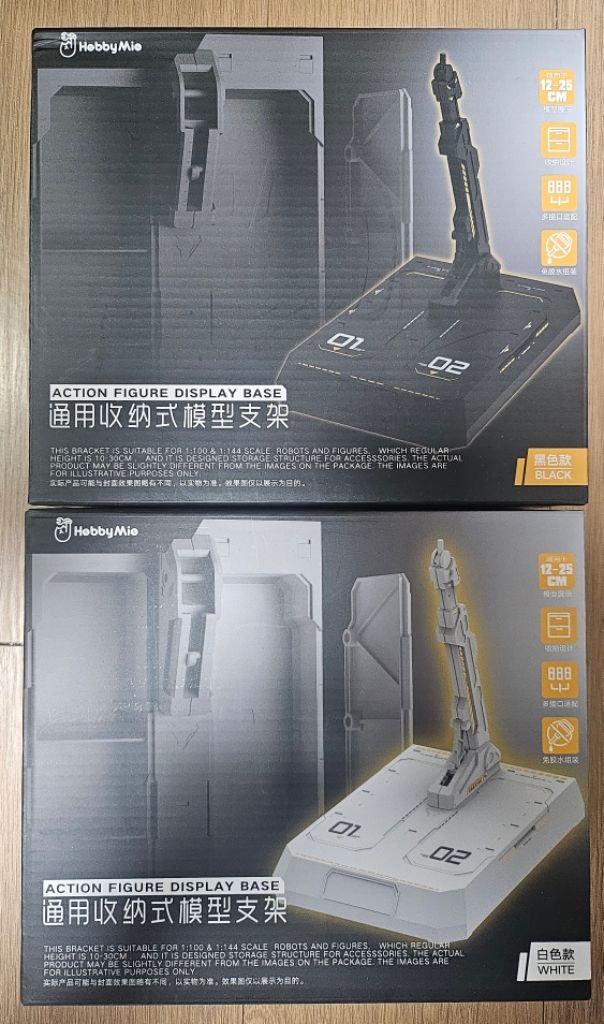 하비미오에서 나온 격납고 디자인의 1/100 사이즈 전용 건프라 디스플레이 액션 베이스입니다. 블랙&화이트 2종 일괄로 판매합니다. 기본적으로 액션베이스1의 가동을 가지고있으며 발판을 열면 안에 각종 여분파츠를 수납할 수 있는 공간이 있습니다. 또한 동봉된 습식데칼로 디테일을 추가시킬수 있습니다. 조립과정에 나사도 쓰여 굉장히 튼튼합니다. (풀아머 유니콘, 하이뉴건담 HWS를 올려둬도 미동도 없었습니다.) 사이트 정가는 각 13000원입니다. 택배비 5000원