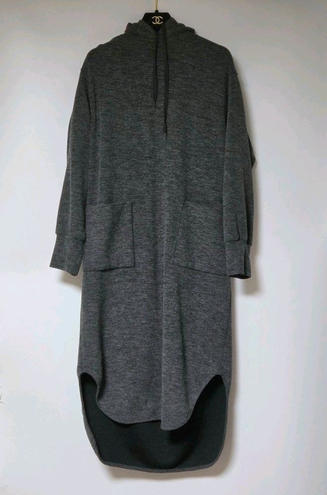 편안하게 입기 좋은 한섬 폼더스토어 THE STORE 후드 니트 원피스 2019년 매장에서 구입한 초판 품번 소재 폴리에스터 89, 레이온 9, 폴리우레탄 2% 택 사이즈 S인데 넉넉하게 나와 실측 가슴 반품 54, 기장 뒤쪽 후드 아래 112cm 중간 기준 앞쪽이 뒤쪽보다 7cm 정도 짧음 양쪽 큰 포켓 있고 후드 부분 스트링으로 조절 가능 안감에 하얀 털들은 먼지가 아니라 원래부터 있던 것임