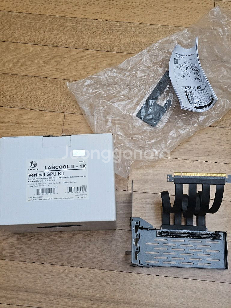 LIAN LI LANCOOL II-1X Vertical GPU Kit입니다 PC 케이스에 장착하여 그래픽 카드를 수직으로 설치할 수 있도록 도와줍니다 박스에 포함된 모든 구성품이 있습니다 PCI 3.0 라이저 킷이고요 랜쿨 케이스 용이었는데 케이블만 떼서 장착할 수도 있습니다. 호환여부는 각자 알아봐야겠네요. 호환안된다고 반품받지 읺아요 소액이라 택배만 합니다. 27000원이고 택배비용은 제가 부담합니다