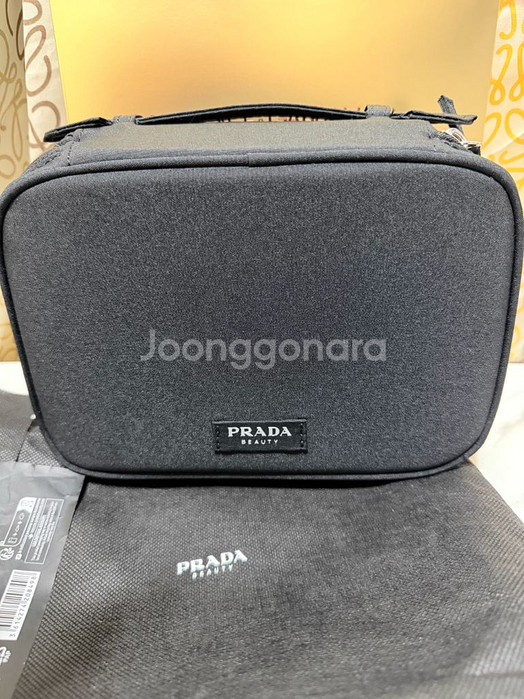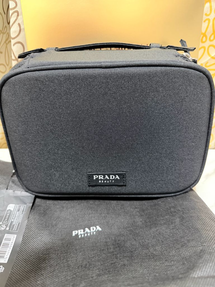 프라다 뷰티에서 나온 블랙 트래블 파우치입니다. 손잡이가 달려있어 휴대하기 용이합니다. 파우치 안에 거울이 내장되어있어 좋아요! 가로:22 세로:15