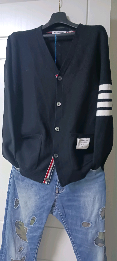 톰브라운 4바 스트라이프가 포인트인 네이비 가디건이에요. 깔끔한 상태로 보관되어 있고, 클래식한 디자인이 매력적입니다.