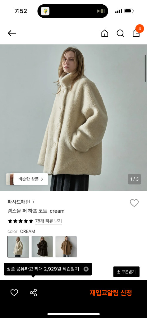 파사드패턴 램스울 퍼코트 크림 s 스몰