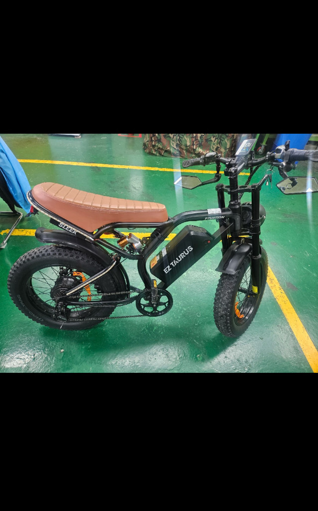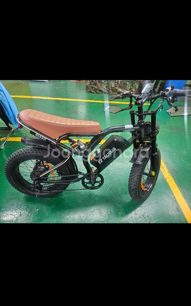 EZ Taurus 전기 자전거입니다 - 검정색 프레임에 브라운 색상의 안장이 있습니다 - 20인치 4.0팻 타이어 장착 - 배터리에 'EZ TAURUS'라고 적혀 있습니다 - 제조일자: 24년 7월 6일 배터리 20ah입니다 -소화팩장착대있습니다 -48v 850w -pas , pas스로틀겸용 -방수등급 ipx4 왼쪽 안장 하자 있습니다 사진확인 직거래만 합니다