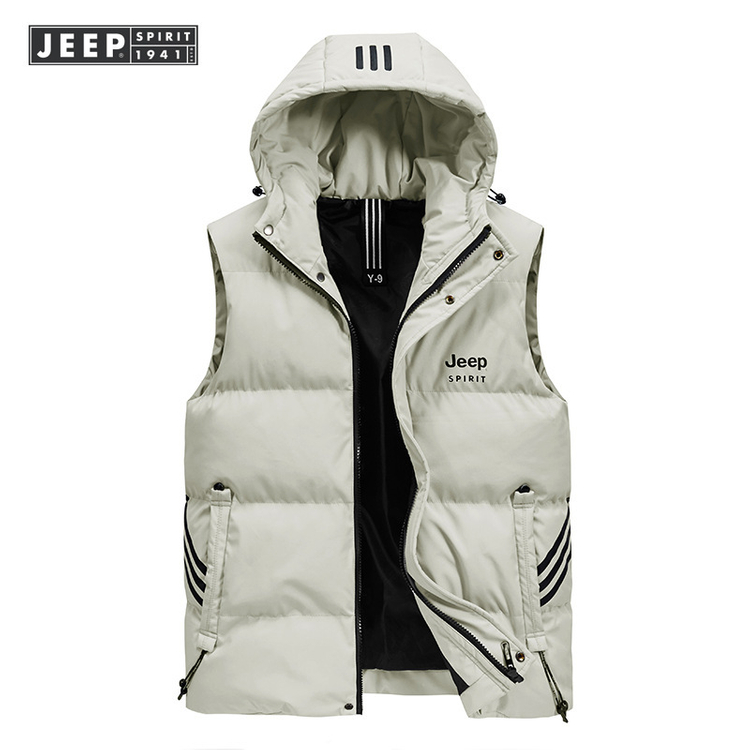 새상품 남성용 후드 패딩 조끼예요. 베이지 컬러에 블랙 안감으로 깔끔하고 실용적인 디자인입니다. 겨울철 레이어링하기 좋은 아이템이에요! 사이즈 L