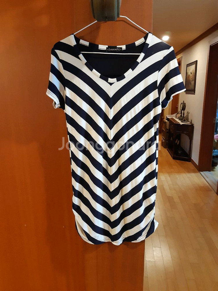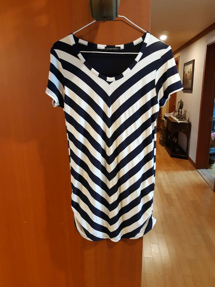 네이비와 화이트 스트라이프 패턴의 반팔 티셔츠입니다~전체적으로 깔끔한 상태입니다.양쪽에 셔링이 잡혀있습니다~ 010 9008 8932 문자주세요~