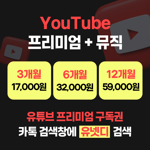 저희는 중고나라 공식 판매자로 인증받은 셀러입니다. 사후지원(A/S) 및 환불 등 철저하게 책임지고 진행하고 있으니 안심하고 구매하셔도 됩니다. 구매는 ka톡 채널 추가 하셔서 문의부탁드립니다! 문의량이 많아 개별 채팅으로는 확인이 어렵습니다. ka톡 : "유넷디" 검색 후 문의 3개월 : 17,000원 6개월 : 32,000원 12개월 : 59,000원 유튭 프리미엄 초대장 이메일로 보내드리고 수락하시면 적용됩니다.