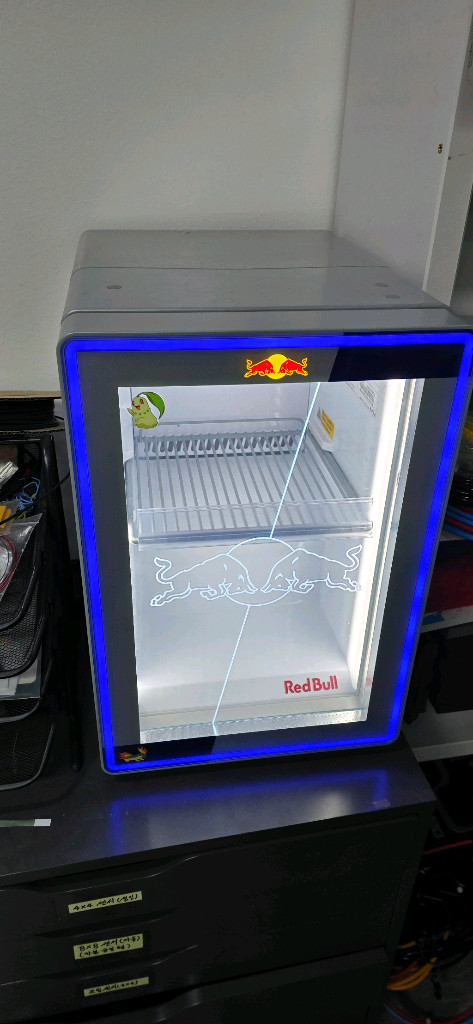 정품 LED 냉장고로 48L 용량입니다. 내부에 브랜드 로고가 선명하게 프린팅되어 있고, LED 조명이 화려한 블루 컬러로 되어 있어요. 사용감은 있지만 작동 상태 양호합니다.