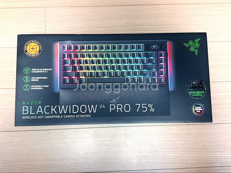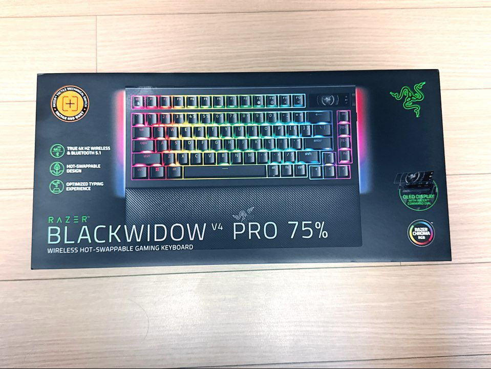 웨이코스 정발 RAZER 블랙위도우 V4 프로 75% 무선 기계식 게이밍 키보드 판매합니다. 현재 레이저 최고가 플래그십 기계식 게이밍 키보드입니다. 무선으로 4000Hz 폴링레이트 지원하고 핫스왑 스위치, OLED 스크린 등이 특징입니다. 밀봉씰 붙은 완벽한 새제품입니다. 송파역 근처 헬리오시티에서 직거래하거나 택비 5,000원 추가하시면 편의점택배 보내드립니다. 연락주세요.