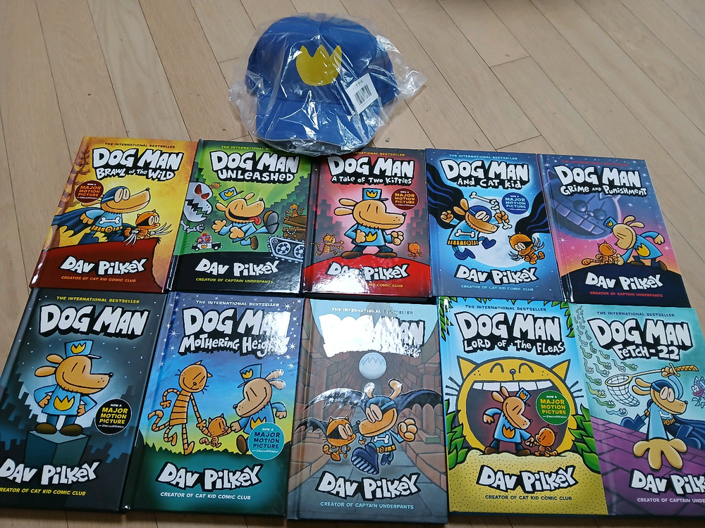 dog man 원서 총 10권과 사은품모자까지 포함된 세트예요. 한번도 펴지 않아 쩍쩍 소리나는 새책입니다. 알라딘에서 샀고 애초에 박스없는 걸로 구매했어요. 촬영하려고 꺼냈고, 배송받은 알라딘 박스 그대로 배송드릴께요. 환불 반품 안됩니다. 네고 안됩니다.