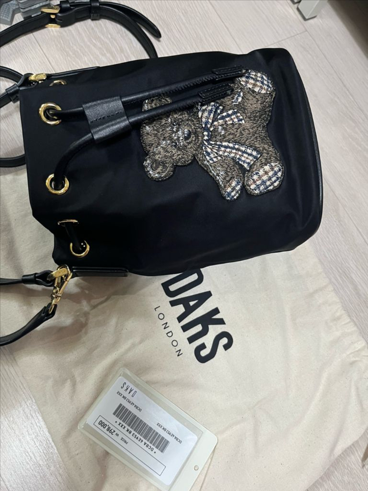닥스 블랙 버킷백입니다 귀여운 테디베어 자수 장식이 포인트예요 내부는 닥스 특유의 체크무늬로 되어있습니다 더스트백 함께 드립니다 1회 사용 사이즈 16 X 22 X 폭 11cm 원형 버킷이라 수납력 좋아요 에눌문의는 답변안드려요 착불입니다. 지에스 반택가능(익일접수)