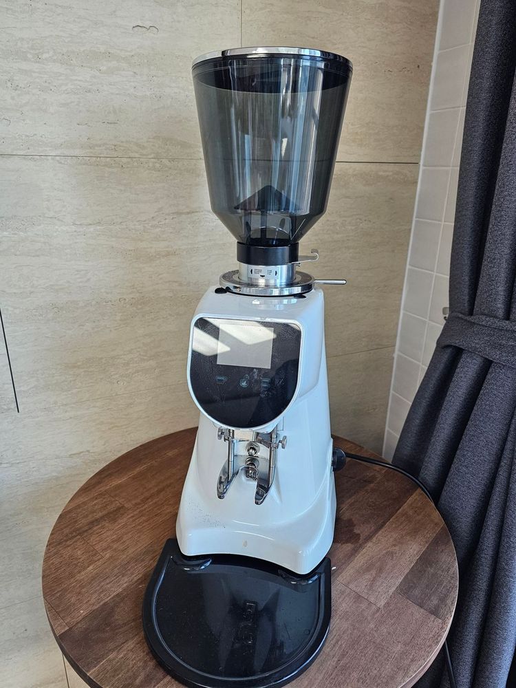 전자동 커피 그라인더예요. 화이트와 블랙 컬러로 깔끔하고 전자 디스플레이가 있어서 사용하기 편리해요. 상태 양호한 중고 제품입니다. Felice A80 전동 커피 그라인더 (220V/420W) / 포터필터 장착형 / 분쇄도 조절 가능 / 상태 양호 / ₩250,000(네고 가능) 상업용 느낌의 전동 그라인더(모델 A80). 분쇄도 미세→굵음 조절 가능, 파우더 배출구는 포터필터 장착형으로 에스프레소 작업에 적합합니다. 브랜드명: Felice (본체 로고) 모델: A80 (바닥 라벨) 전원/출력: 220–240V, 420W, 50–60Hz 상태: 중고(작동 양호), 외관에 사용감·약간의 스크래치 있음 분쇄도 조절: 굵음 ⇄ 미세(다이얼/눈금 표시) 용도: 에스프레소(포터필터 장착형) / 드립용 굵기까지 가능 구성: 그라인더 본체, 호퍼(원두통)뚜껑 포함, 드립 트레이(받침), 포터필터 걸이(본체에 장착된 형태) ,전원 케이블