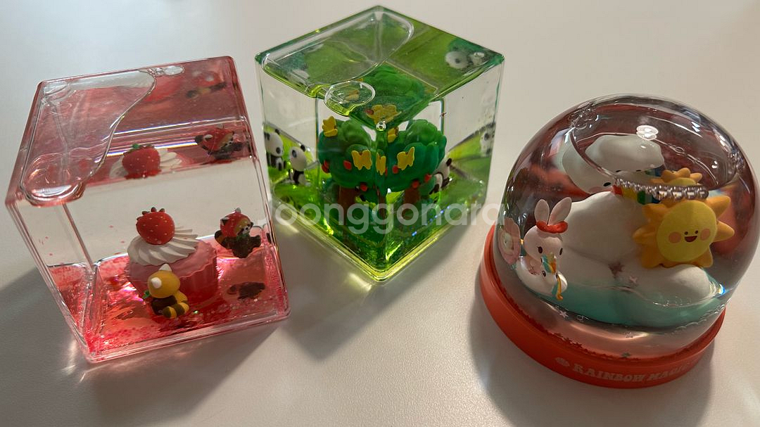 귀여운 캐릭터들이 들어있는 리얼글로우 글리터볼 3개 세트예요. 상태 양호하고 아이들이 좋아할 만한 예쁜 디자인입니다. 선물용이나 인테리어 소품으로도 좋을 것 같아요!