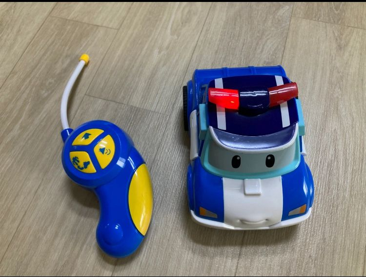 로보카 폴리 RC카. 직진, 사이렌,회전하면서 변신 기능 있어요. 사진처럼 리모컨 볼트 부분이 헐거워져서 이건 감안하고 구매해주세요. 작동 잘 됩니다.