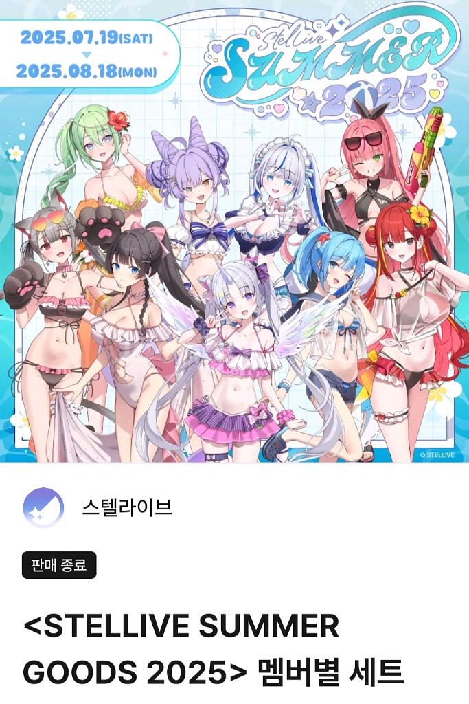 스텔라이브 썸머굿즈 2025년 멤버별 굿즈 세트이고 미개봉 상태로 보관중입니다. 멤버별 세트 - 1세트당 11만원 판매중 유니 시로 부키 / 린 / 나나 리코 - 완료 히나 - 완료 리제 - 완료 타비 - 완료