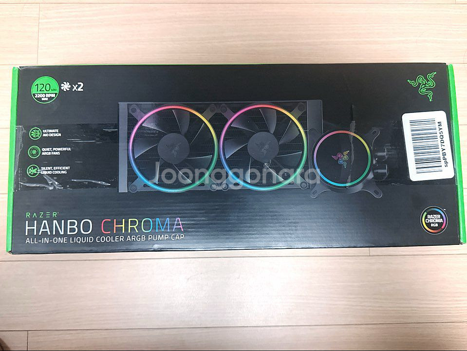 RAZER HANBO 크로마 240mm 2열 수냉 쿨러 판매합니다. 펌프와 쿨링팬 조명을 레이저 제품답게 시냅스에서 다양하게 컨트롤할 수 있습니다. 쿨링 성능도 무난하구요. 작년 10월 아마존에서 재고 얼마 남지 않았을때 새제품 구입했고 지금 들어가보니 현재 구할 수 없습니다. 국내 정발 제품도 아예 못 구하구요. 레이저 itx 시스템 조립하려고 구입했던건데 계획이 바뀌어 그냥 판매합니다. 배송받고 뜯어본 적 없습니다. 밀봉씰 붙은 완벽한 새제품입니다. 송파역 근처 헬리오시티에서 직거래하거나 택비 5,000원 추가하시면 편의점택배 보내드립니다. 연락주세요.