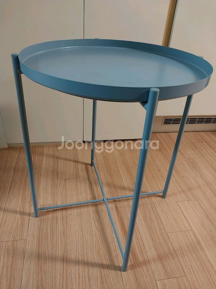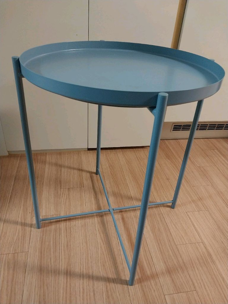 이케아 블루 컬러의 원형 테이블이에요. 상판과 다리 모두 깨끗한 상태로 실용적이고 심플한 디자인이 매력적입니다. 거실이나 침실 어디든 잘 어울릴 것 같아요!
