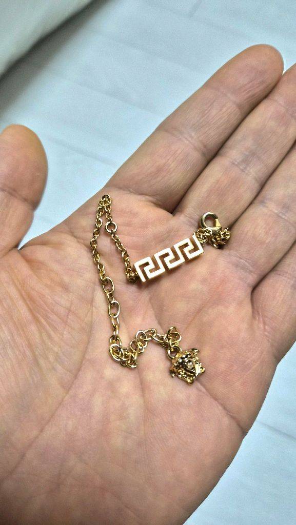 정품 골드 메두사 참 팔찌예요. 클래식한 그리스 키 패턴과 메두사 참이 포인트인 세련된 디자인이에요. 상태 양호하고 고급스러운 느낌 그대로 유지되고 있어요. 줄길이 23cm인데 고리를 거는 방식이라 줄길이 조절이 가능합니다. 줄두께 대략 2nn정도 됩니다