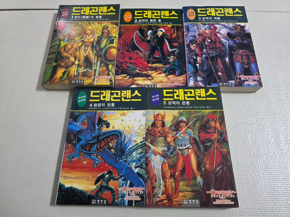 TRPG 던전앤드래곤 공식 소설인 드래곤랜스 1~5권 세트입니다. 세월감으로 사이드 및 뒷면 노후가 있지만 내용은 양호합니다. 총 6권이지만 마지막 권이 없는 관계로 저렴하게 판매하고다 합니다.