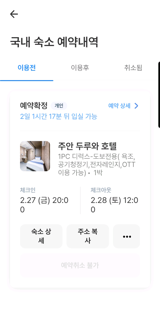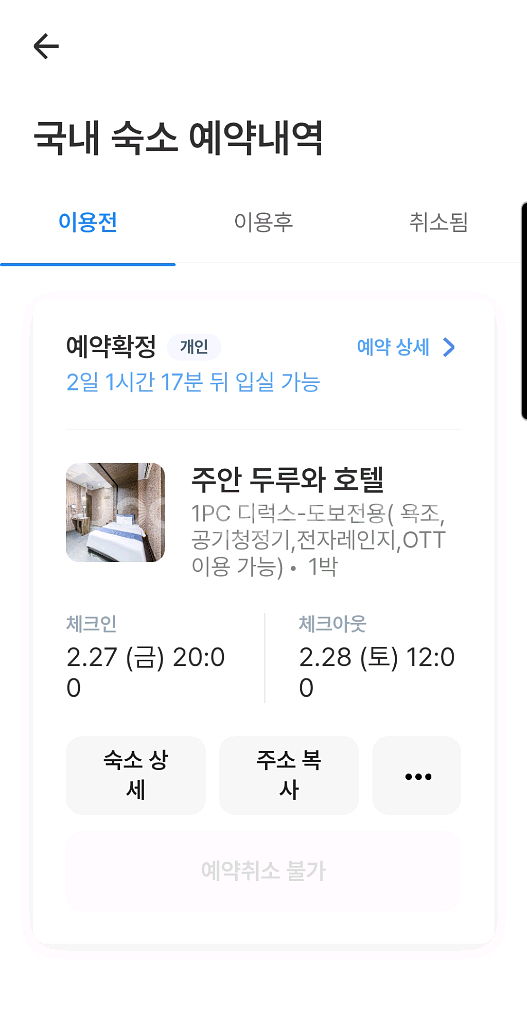 개인정보(거래정보)를 주고받는 행위는 사기에 노출될 수 있으므로 즉시 중고나라로 신고해 주세요인천 주안역 두루와 호텔 1PC 디럭스 도보전용 객실 숙박권입니다 욕조, 공기청정기, 전자레인지, OTT 이용 가능합니다 이번주 2월27일 금요일 8시 입실입니다 공 1 공 5621 오 이 오 이