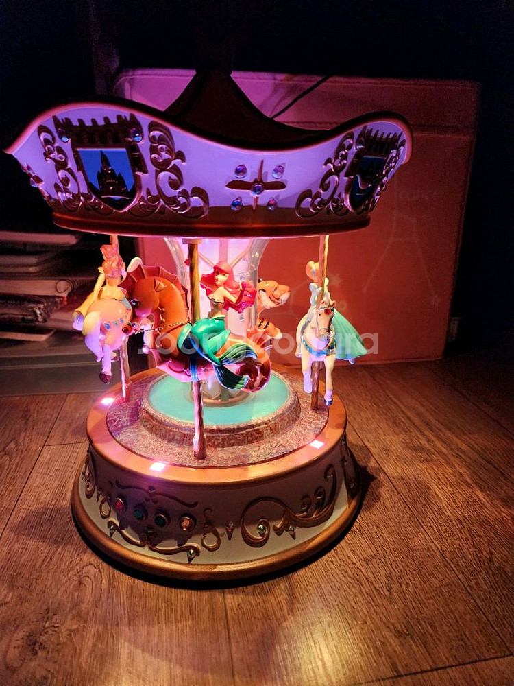 디즈니 팬들과 컬렉터들 사이에서 소장 가치 높기로 유명한 '홀마크 케이프세이크(Hallmark Keepsake) 디즈니 프린세스 회전목마' 판매합니다. 단순한 피규어가 아니라 빛(Light), 소리(Sound), 움직임(Motion) 기능이 모두 들어간 고급 사양 모델입니다. 전원을 연결하면 공주들이 각자의 테마곡에 맞춰 회전하며 환상적인 분위기를 연출합니다. 110볼트 아답터 단자이지만 220볼트 사용가능한 아답터라. 220볼트용 돼지코만 있으면 됩니다