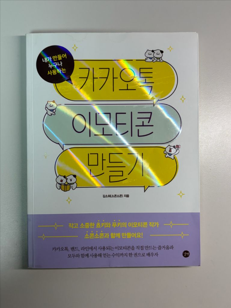 카카오톡 이모티콘 만들기 책 판매합니다 김소희(소콘소콘) 작가님의 책 입니다 구매한지 꽤 오래되어 표지 변색과 얼룩이 있습니다 책은 1~2번정도 읽어 내부는 괜찮습니다 정가 16000원 -> 8000원에 판매합니다 가격제안 받으니 편하게 연락주세요 GS/CU반값알뜰택배만 사용합니다