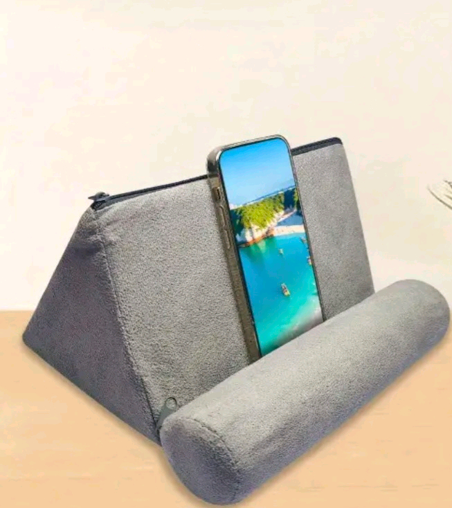휴대용 쿠션이에요. 스마트폰이나 태블릿을 올려놓고 사용할 수 있는 스탠드 형태로 되어있어요. 그레이색상이고 잠깐사용해본거라 깨끗해요~~^^