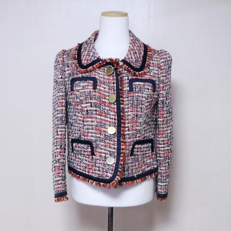 고급스러운 트위드 자켓이에요. 멀티컬러 트위드 소재에 네이비 트리밍과 골드 버튼이 포인트로 되어있어서 세련된 느낌입니다. 상태 양호하고 착용감도 좋아요! [실측사이즈cm] 가슴-46 총장-42 어깨-36 팔길이-50 [상품설명] 옷은이상없으나 버튼부분은 사용감있습니다 나머진 깨끗합니다 [공지] 반값택배 하지않습니다! 사실분만채팅바랍니다.상품하자있을시 설명란에 기재합니다.재차질문은 가격이저렴한만큼 양해부탁드립니다 오후2시이전 결제시 당일배송되며 택배사CJ입니다 *상품 표기 사이즈와 실제 사이즈와는 사이즈 차이가 있을 수 있으니, 꼭! 실측 사이즈를 참고해주세요. *실측사이즈는 1~3CM오차범위있을수있습니다