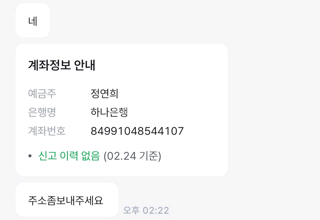 사기꾼 이니 당하지 마시오 (정연주 하나은행 84991048544109) 위 계좌이고 사기 당시 별명은? (연주맘ㅋ) 이었음 중고나라 사기조회 해도 사기 전력이 없다고 뜸 경찰에 신고하고 중고나라에도 신고 했음 사기요령은? 물건값의 절반은 선금받고 물건 받고 나머지를 받겠다는.. 구매자를 현혹시킴 선금을 사기치는 수법임 사기품목은? 구글 네스트 오디오 스피커 임