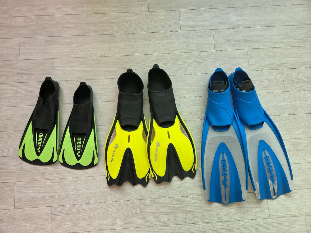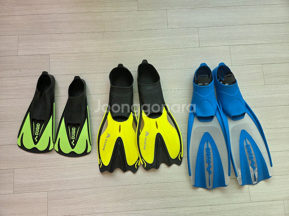 모두 미국 여행때 샀어요. 작은 연두형광 아레나는 210 큰 파란 아레나는 230 아큐 노란색은 240사이즈입니다. 아레나 2개는 개당 만8천원 노란색 오리발은 만5천원이예요. 받으신후 반품 금지요. 예민맘, 까칠맘 피해주세요.