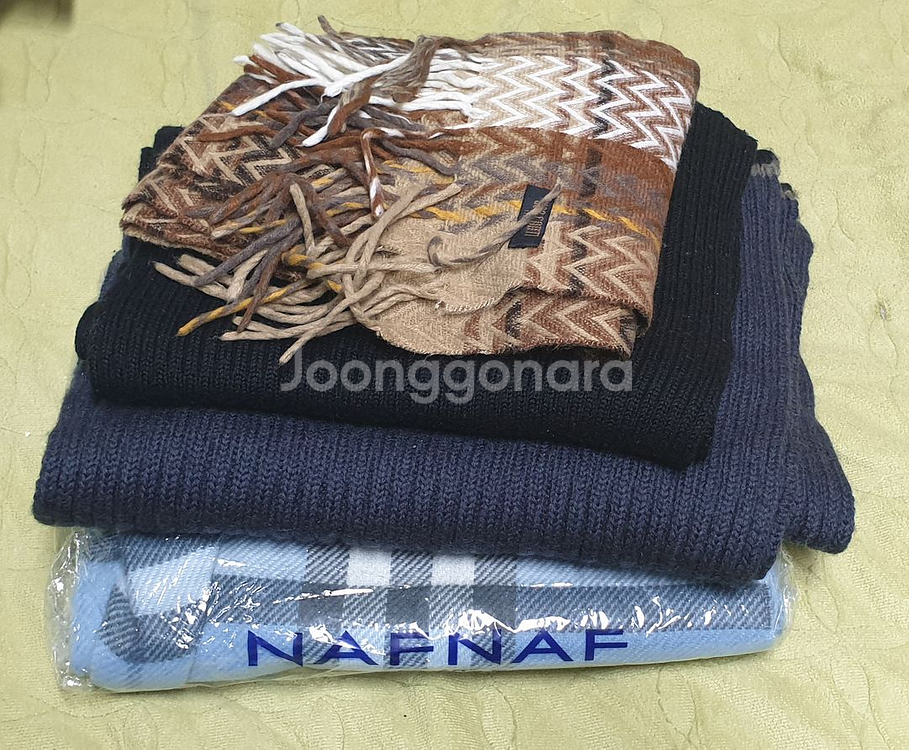 물건정리중 보관만 하고 있어 목도리 4개 일괄 처분합니다. 사진 보다시피 예전에 착용후 보관중이거나 미개봉품도 있습니다. 각 제품 실사진 잘 확인해주세요. (착용감, 세월감등. 확인바랍니다.) 1. NAFNAF 목도리 --> 폭 30cm 정도 미개봉품이라 길이? --> 미개봉 보관제품 (외부 비닐 보관/세월감) 2. NIX --> 폭 30cm 정도, 길이 186cm --> 사용후 보관하여 사용감 있습니다. 실사진 참고바랍니다. 3. UGO GONTI 목도리 --> 폭 18cm 길이 약 150cm --> 사용후 보관하여 사용감 있습니다. 실사진 참고바랍니다. 4. 2=S 목도리 --> 폭 26cm 길이 약 150cm --> 사용후 보관하여 사용감 있습니다. 실사진 참고바랍니다. 구입후 반품/환불 정중히 사절드립니다.