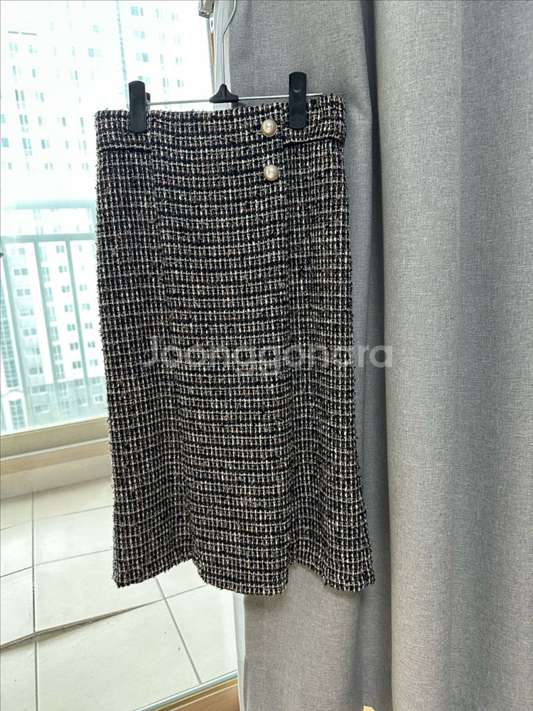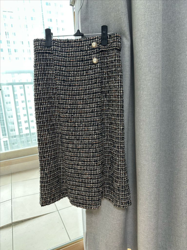 진주 버튼 디테일이 포인트인 h라인 트위드 스커트이에요. 한번 입었고 최상의 상태입니다. 실제 색상이 마지막 사진과 가장 흡사합니다. 허리 단면: 35cm / 총장: 66cm ✔️환불X, 신중한 구매 부탁드립니다:)