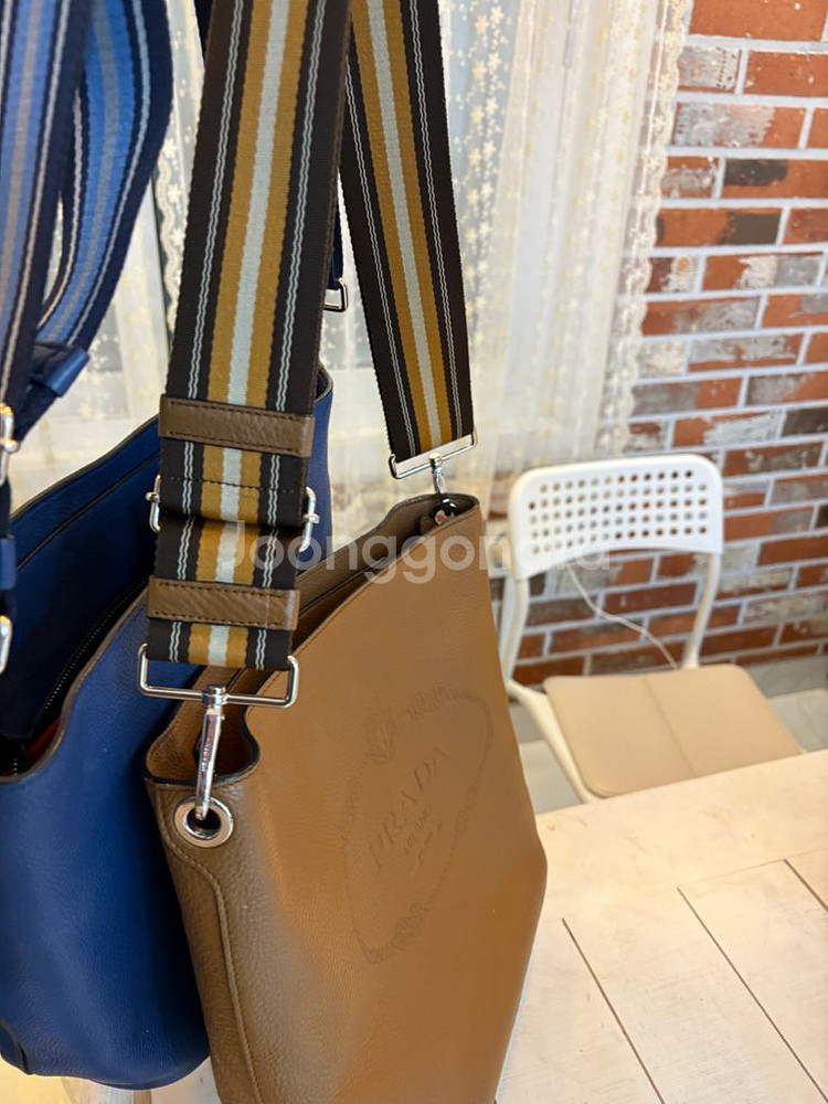 프라다 비텔로 가죽 크로스백입니다. 브라운 색상과 남색 가방과 스트라이프 숄더 스트랩이 포인트입니다. 크로스백이라 가볍게 들고 다니기 좋아요. 아울렛에서 샀어요