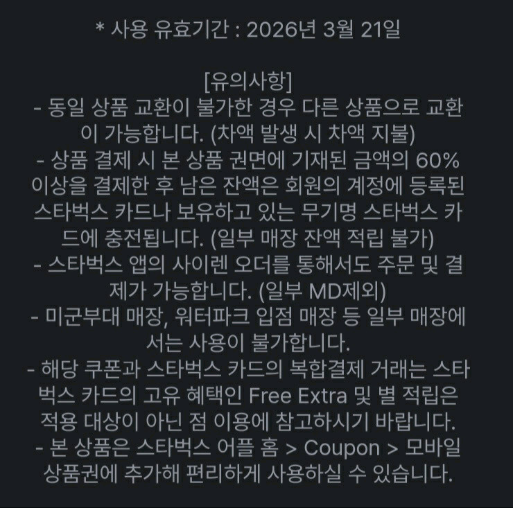 26년 3월 21일까지이고 번호만 있고 바코드가 없어서 스타벅스앱 사용하시는분이 앱에 등록해서 편하게 사용하셨으면 좋겠습니다