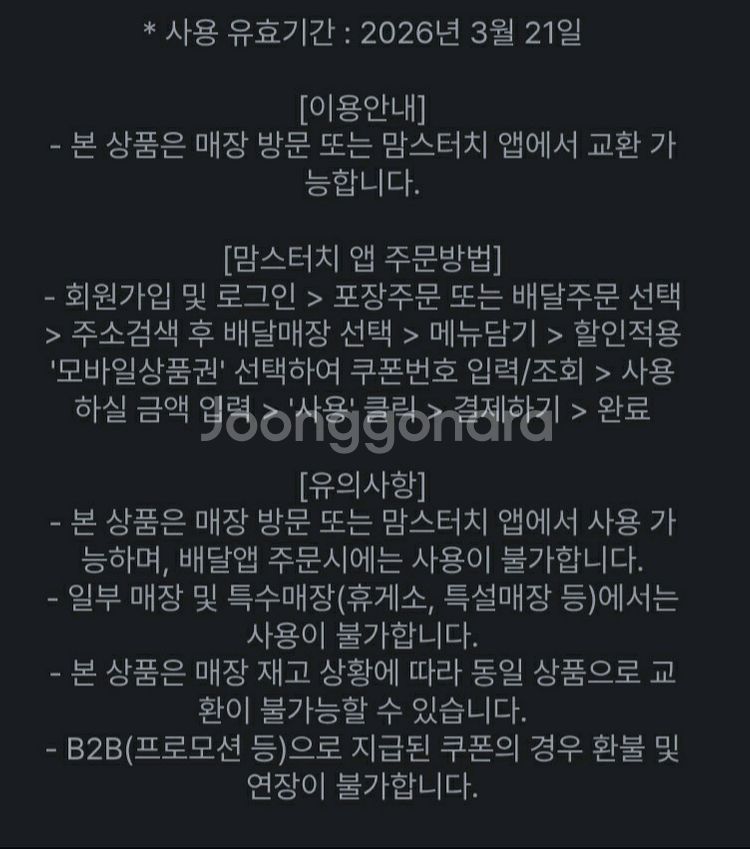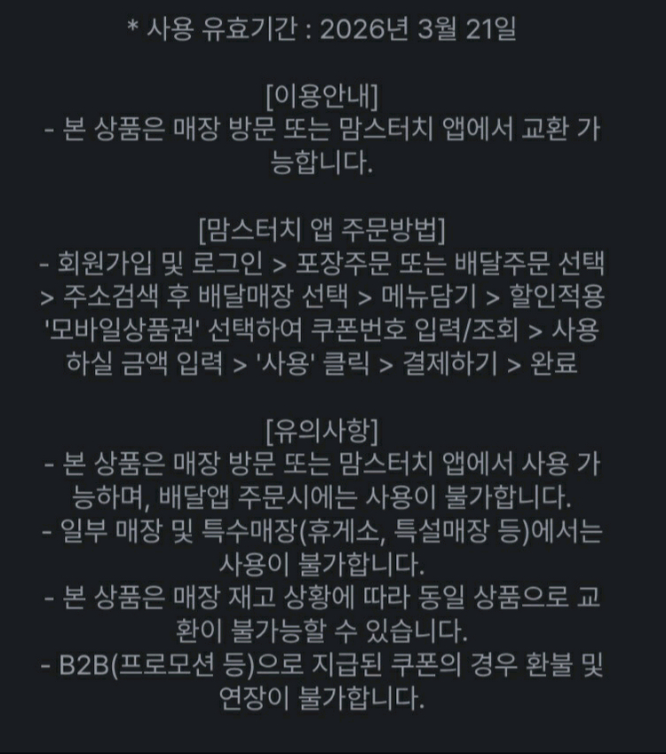 26년 3월 21일까지이고 번호만 있고 바코드가 없어서 맘스터치앱 사용하시는분이 앱에 등록해서 편하게 사용하셨으면 좋겠습니다 앱에 등록하면 7400원 금액권처럼 사용가능합니다