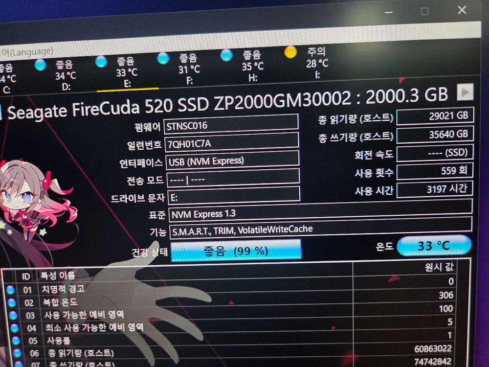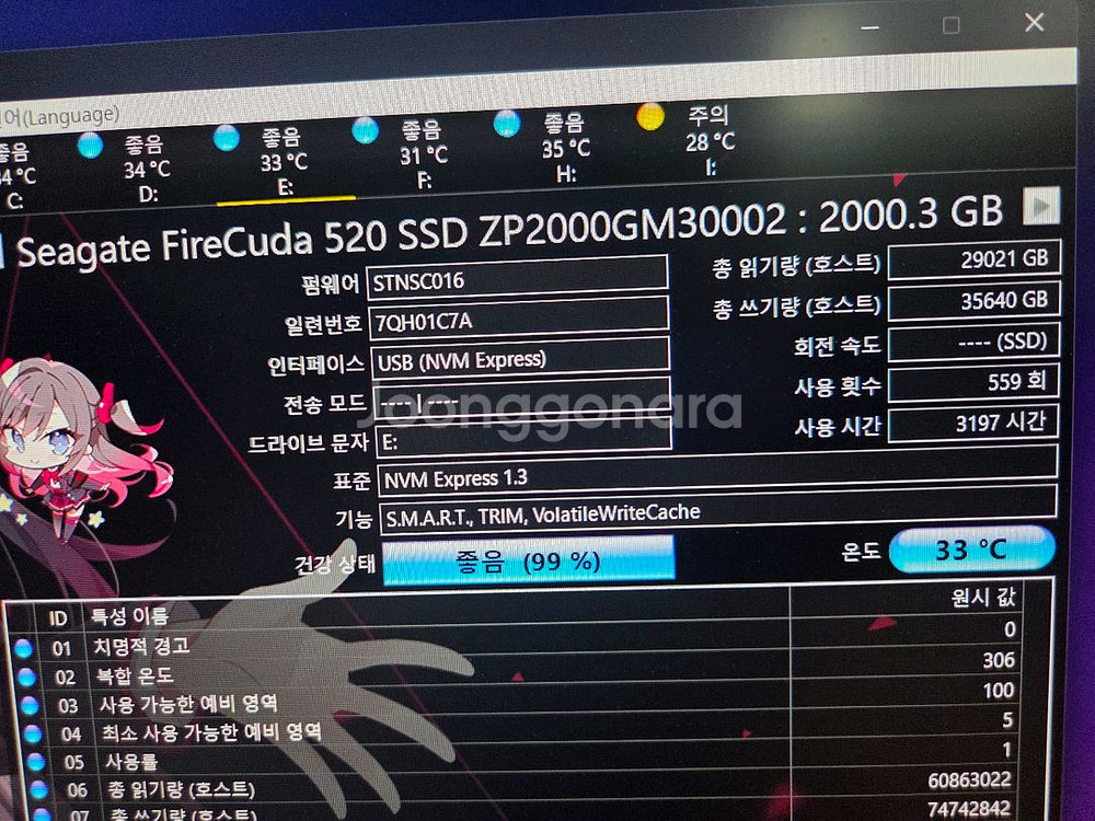 22년 3월 21일 11번가 구매 보증 5년입니다 상태는 첨부한 크리스탈디스크인포 참조바랍니다