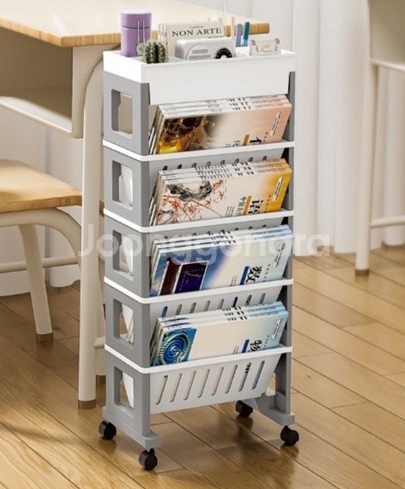 책이나 소품 정리용으로 완벽한 5단 이동식 선반이에요. 바퀴가 달려있어서 이동이 편리하고 상태도 깨끗합니다. 실용적이고 공간 활용도 좋아요!