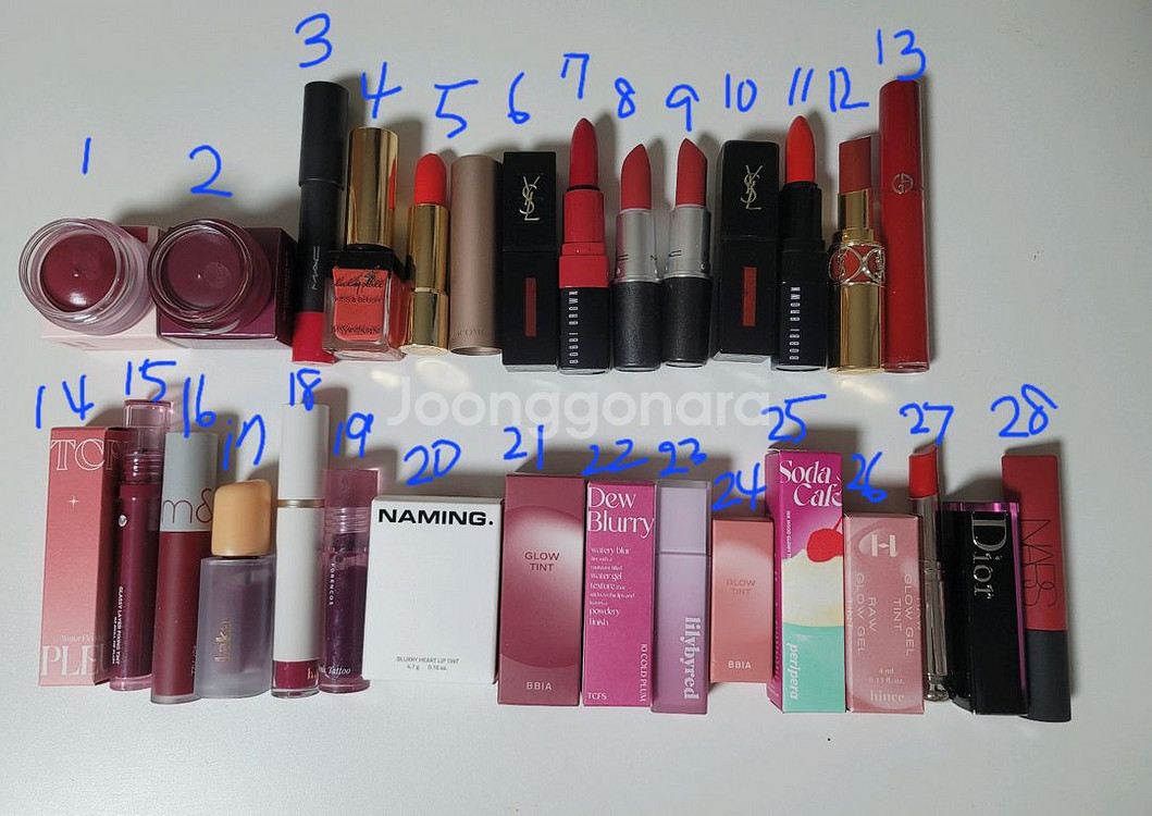 -립- 1. 홀리카 홀리카 멜팅 블러 립 팟 11 더닝- 7000원 2.AOU 매트 포슬밤 04 콜드밤 -11000원 3.맥 립펜슬 5000원 4. 입생로랑 키스앤블러쉬 4호 (3/4 남음)- 15000원 5. 랑콤 압솔뤼 루즈 인티마뜨 130 낫플러팅 -18000원 6. 입생로랑 바이닐 틴트 409호 (2회 사용) 26.09- 30000원 7. 바비브라운 립스틱 펀치- 13000원 8. 맥 립스틱 week,werk,werk (1회사용이나 케이스 살짝 끈적)-12000원 9. 맥 레이디버그 -10000원 10. 입생로랑 바이닐 틴트 401호(3/5남음)-20000원 11 바비브라운 블레이징 레드 -11000원 12. 입생로랑 루쥬 볼립떼 샤인 80호 - 25000원 13. 조르지오 아르마니 립마에스트로 402 - 19000원 14. 투쿨포스쿨 플레르 틴트 1호 드리즐 (새상품) 23년제조 -4000원 15. 릴리바이레드 글래시 레이어 픽싱 틴트 3호 킬미 플럼 (색상만 확인) 25.4.26 - 5000원 16. 롬앤 제로벨벳틴트 07 피즈 (1회사용) 23년까지-3000원 17. 라카 프루티 글램틴트 115엔비(1회사용) 26.1까지-8000원 18. 힌스 무드인핸서 워터 리퀴드 글로우 인플루언스 (색상만 확인)25.07.14 - 8000원 19. 포렌코즈 속타투 틴트 08 마티디 27.06-5000원 20. 네이밍 블러리 하트 립틴트 크레이브 26.11-10000원 21. 삐아 글로우 틴트 03모브 보틀 - 7000원 22. 투쿨포스쿨 듀 블러리 틴트 10호 콜드플럼 24년 10월제조- 6000원 23. 릴리바이레드 스윗 라이어 밀키 틴트 26.9 07 믹스베리 수플레인척 -7000원 24. 삐아 글로우 틴트 미니 00로지보틀 (새상품) - 4000원 25. 페리페라 잉크 무드 글로이 틴트 26왤케 포도-6000원 26. 힌스 로 글로우 젤 틴트 칠(새상품) 26.08.18 -7000원 27. 디올 어딕트 라커 스틱 744 파티레드 - 16000원 28. 나스 에어매트립 파워트립 (2회 사용)-15000원 29. 오아드 립티크 006 (1회사용)-20000원 박스에있는건 거의 꺼내서 색상확인정도만 한것들입니다 -섀도우- 30. 릴리바이레드 무드키보드 02사랑할수밖에없는모브로부터 26.08 -9000원 31. 롬앤 베러 댄 아이즈 말린메밀꽃 26.10 -6000원 32. 미샤 섀도우팔레드 (페일블룸, 핑키 썬레이, 슈퍼샤이, 프롬핑크) 페일블룸, 프롬핑크 한번씩 사용 -13000원 33. 데이지크 무드 섀도우 팔레트 02쿨베이직 27.07 몇가지 색상 한두번 발색-18000원 34.비세섀도우 pk2 (1-2회사용,사용감 사진확인)-10000원 35. 터치인솔 메탈리스트 스타라이트 팔레트 23.08.28 -1000원 36. 에뛰드 레이디얼그레이 27.12 (1회사용)- 3500원 37. 스틸라 쥬얼 아이섀도 골든토파즈 (1회사용)-25000원 38. 엑셀 샤이니섀도우 브론즈골드 SI01(1회사용) -10000원 39. 어딕션 더 아이섀도우 스파클 004sp (1회사용)-15000원 40. 톰포드 크림 섀도우 핑크 헤이즈 (새상품) - 50000원 41. 어반디케이 문더스트 아이섀도우 솔스티스(새상품)-16000원 42. 홀리카홀리카 아이섀도우 타로튜튜 28.02(1회사용)-3000원 43. 홀리카홀리카 아이섀도우 로즈토프 27.06(1회사용)-3000원 44. 홀리카홀리카 아이섀도우 로탈릭 26.09(개봉한새상품) -4000원 45. 맥 섀도우 리필용 쿠퍼링(1회사용) -5000원 46. 오아보 리퀴드아이섀도우 26.6(1회사용)- 8000원 48. 투쿨포스쿨 프로타주 펜슬 9호쉬어누드 22년제조-3000원 49. 투쿨포스쿨 프로타주 펜슬 1호 샤이닝린넨 (부러짐)22년제조 -3000원 50.투쿨포스쿨 아트 클래스 매지컬 픽싱 마스카라 1호 클리어 블랙 (새상품) 26.01.30 -5000원 51. 데이지크 무드업 마스카라 02 초코브라운 (새상품)27.7.28 -8000원 52. 홀리카홀리카 마이페이브 피스빔 슈가리스(미사용) 27.04.29-5000원 -블러셔- 53. 릴리바이레드 러브빔 블러치크 라벤더 블러 27.7-7000원 54. 릴리바이레드 러브빔 블러치크 체리블러27.1 -7000원 55. 이글립스 올오버 블러셔 클라우드27.1 - 9500원 56. 투페이스드 러브 플러쉬-30000원 57. 어바웃톤 스킨 레이어 핏 블러셔 C02 뮤트모브28.1(새상품)-8000원 58. 어바웃톤 스킨 레이어 핏 블러셔 C06 밀크 코코아28.3(새상품)-8000원 59. 디어달리아 페탈 드롭 리퀴드 블러셔 퓨리티 27.07-16000원 60. 디어달리아 페탈 드롭 리퀴드 블러셔 소프티 28.11(새상품,케이스없음)-18000원 61. VDL 치크스테인 블러셔 08모브헤이즈 27.02-10000원 62. 클리오 에어 블러 휩 블러쉬 10딸기듬뿍토핑 27.12- 8000원 63. 클리오 에어 블러 휩 블러쉬 11 타로 밀크티26.11- 8000원 64. 얼터너티브스테레오 바미 크림치크 07타로라떼27.11- 9000원 65. 얼터너티브스테레오 바미 크림치크 02스트로베리밀크 27.11-9000원 66. 네이밍 플러피 파우더 블러쉬 야미27.9 -9000원 67. 네이밍 플러피 파우더 블러쉬 어빗(새상품)27.6-10000원 68. 오프라 블러쉬 핑크새틴 27.11 -19000원 69.데이지크 소프트 블러치크 02핑크 크림 27.8 -6000원 70. 데이지크 소프트 블러치크 04핑크 리본(새상품)27.8- 8000원 71. 데이지크 블렌딩 무드 치크 05 바이올렛 니트27.5- 14000원 72. 힌스 듀이 리퀴드 치크 쿨 플러터(새상품) 27.06.30- 8000원 73. 디어에이 플러피 블러쉬 05 커밍 업 로지스 27.06.06 - 7000원 74. 에스티로더 퓨어컬러 러버스 블러쉬 (사용감 사진 확인 2회 사용)- 35000원 75. 비오브 믹스 매치 치크팔레트 02쿨믹스 27.5- 21000원 76. 삐아 라스트 블러쉬 09체리쉬 (새상품) 27.08-7500원 77. 하밍 젤리 에어 치크 06포그타로 28.1-13000원 78. 하밍 젤리 에어 치크 05오간자 28.1-13000원 79. 투크 새틴 도화밤 07메모러블 28.4 (새상품) -14000원 80. 투크 새틴 도화밤 02복숭아 28.5- 12000원 81. 데이지크 블렌딩 무드 치크 02쿨 블