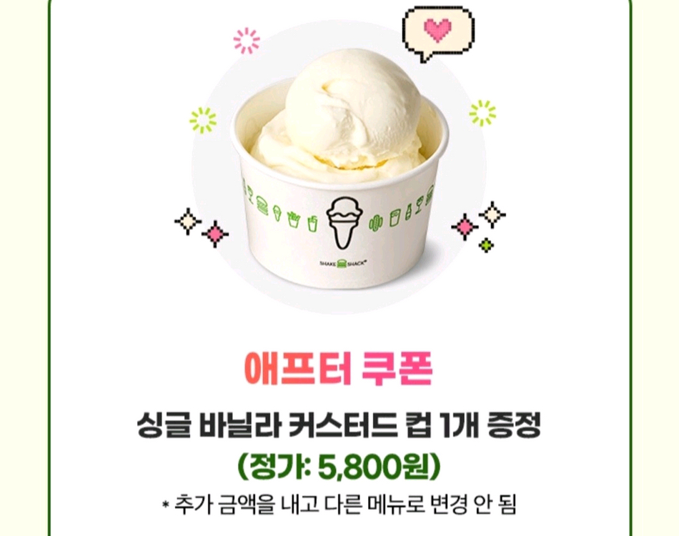 쉐이크쉑 싱글 바닐라 커스터드 컵 1개 증정 입니다. - 사용기간 : 2026.3.23 - 금액 : 1,000원 / 1장당 - 매장직원 쿠폰제시. 키오스크 이용안됨 - 구매후 환불 불가