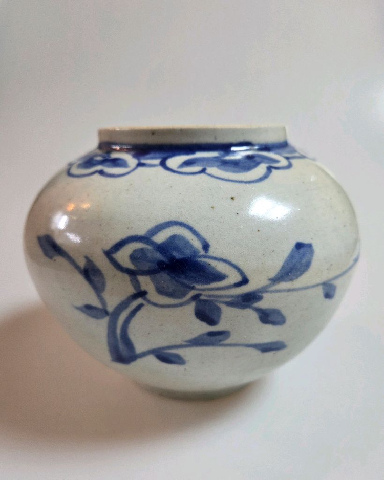 구연은 약간 벌어졌고 목은 동체에 비해 낮은 편이며 어깨쪽으로 좁아든 형태입니다 동체는 상부가 팽배하며 저부로 내려올수록 급격히 좁아드는 모습을 하고 있습니다 목과 이어지는 어깨에는 큼직한 여의두문대가 둘러 져 있습니다 동체에는 화면 전체를 차지할 정도로 모란문과 초문이 시문이 되어있습니다 태토가 잘 정제되어 수비가 잘되었고 청화 안료의 번짐 없이 유약이 잘 자화되었습니다 굽은 낮은 다리굽으로 굵은 모래를 받쳐 번조하였습니다 제원 : 높이 13.5cm 구연부 9cm leedo.co.kr 구경오세요