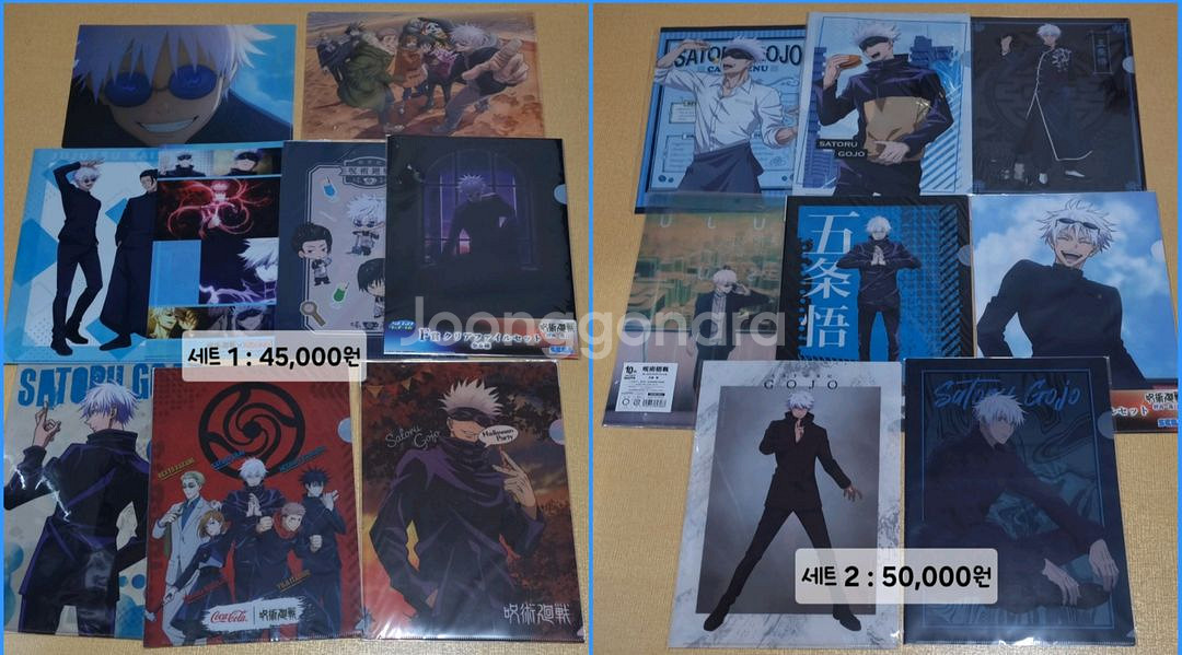 - 구매 전 아래 글 읽고 문의 - 윗치폼에서도 구매 가능합니다 - 중고나라 앱, 윗치폼, 번개장터에서만 판매하며 채팅으로 구매한다며 연락하고 타 사이트 유도, 문자 거래 유도 시 즉시 신고 및 차단합니다. - 구매 문의 외 답변❌ - 개별 양도 ❌. 개별 문의 시 답변하지 않습니다. - 일괄 공식 굿즈. 일괄 미사용(봉투X) 혹은 미개봉 - 배송비 입금 후 접수 시 무게 금액과 차액 발생 시 추가 입금 요청 혹은 차액만큼 반환 처리 해드립니다 - 환불 불가, 찔러보기 ❌, 네고 ❌ - 배송기사님이 물건을 인수하신 이후에 문제 발생 시 택배사에 직접 문의 부탁드립니다. (배송 중 파손 발생, 물건이 다른 지점으로 갔다, 미도착) -------------------- 1. 고죠 클리어 파일 전체 일괄 : 75,000원 (택배비 별도. 포장비 1,000원 별도. 앞뒤 판지로 덮어 뽁뽁이에 감싸 택배 봉투에 넣어 발송) → 포장비는 배송비에 합침. -------------------- 2. 고죠 클리어 파일 세트 1 : 45,000원 (배송비 별도. 포장비 900원 별도. 앞뒤 판지로 덮어 별도 뽁뽁이 없이 안전봉투에 넣어 발송) → 주술회전 회옥옥절 애니메이트 콜라보 카페 클리어 파일, 고죠 할로윈 클리어 파일, 고죠 코카콜라 콜라보 클리어 파일 등 고죠 클리어 파일일괄 -------------------- 3. 고죠 클리어 파일 세트 2 : 50,000원 (배송비 별도. 포장비 900원 별도. 앞뒤 판지로 덮어 별도 뽁뽁이 없이 안전봉투에 넣어 발송) → 고죠 오로라 클리어 파일, 고죠 쿠지 클리어 파일, 고죠 쿵푸 클리어 파일 등 고죠 클리어 파일 일괄