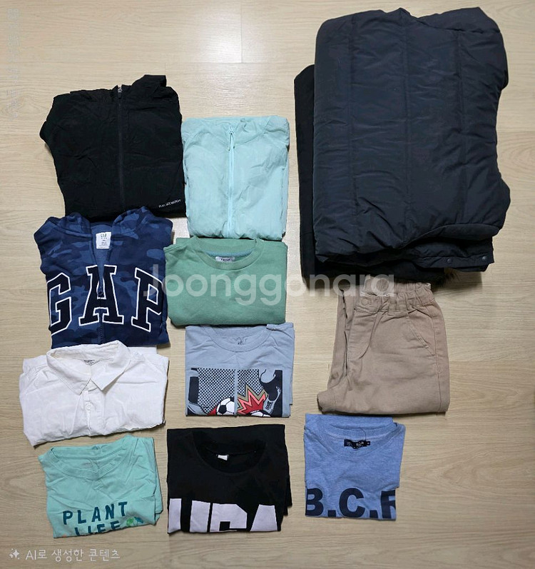 남아 옷 150~160 정도 사이즈 입니다. 일괄 택포 3만 5천원( 덤 포함 12가지 옷) 입니다. * 안심결제 불가, 계좌이체 거래 가능합니다.* 아이 혼자 입어 깨끗한 편입니다. 전체적으로 깨끗하나 2가지의 옷에 약간의 흠 있는 건 사진에 올렸습니다. 침고하세요. * GAP kids(XXL) 기모 후드 집업: 거의 새것 실착용 1회 * 탑텐 키즈 검정색 봄 점퍼(160): 상태 좋음. * 탑텐 민트색 여름 점퍼(160): 왼쪽 소매 약 2~3cm 꿰맨 자국 있으나 거의 표 안남. * 폴햄키즈 기모 티셔츠( 160): 상태 좋은 편 * 긴팔 흰색 셔츠(145): 상태 좋음 * 탑텐 키즈 기모 베이지 바지(160): 상태 좋음. * GAP Kids(XXL) 반팔 티: 상태 좋음. * 밀레 키즈 다운 롱 점퍼(150): 왼쪽 팔 안쪽에 약 0.2mm 2개 정도의 약간의 흠집 보임(자세히 보아야 보임) * 네파키즈 블랙 다운점퍼: 블랙 특성상 약간의 색바람 보임, 세컨드 점퍼로 부담없이 입히기 좋음. * 덤: 반팔 티셔츠 2개, 긴팔 티셔츠 1개 * 교환 및 환불 안됩니다. * 택배 포함 가격입니다. * 구매 원하시면 채팅 연락주세요.(안심결제 불가)