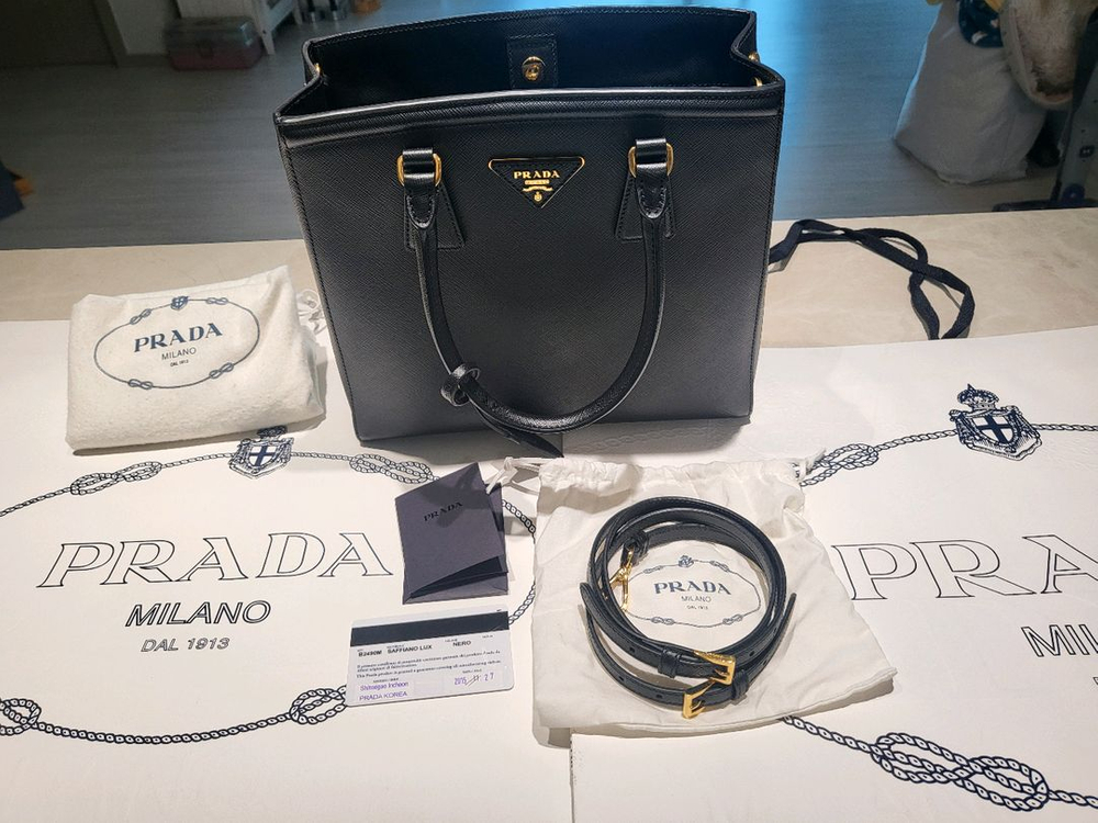 프라다 B2490M 사피아노 럭스백 토트겸 크로스 구매시 그대로 구성품 다 있어요 더스트백2 쇼핑백2 개런티카드 경조사용으로 쓴지라 사용감 많이 없습니다 오염과 스크래치, 온도변화에 강합니다 보관하기 편하실거에요 가방옆면 엣지부분은 살때부터 그래서 무상 AS받았고 저부분은 접히는부분이라 as받아도 또 그럴거라고 하더라구요 그래서 스냅단추 안잠그고 썼어요 안잠그고 쓰는거 추천드려요 크기는 27/24/9 작지도 크지도 않은 미듐사이즈라 수납 잘되고 크로스로 매기도 부담없고 포멀이든 캐주얼이든 활용도 좋아요