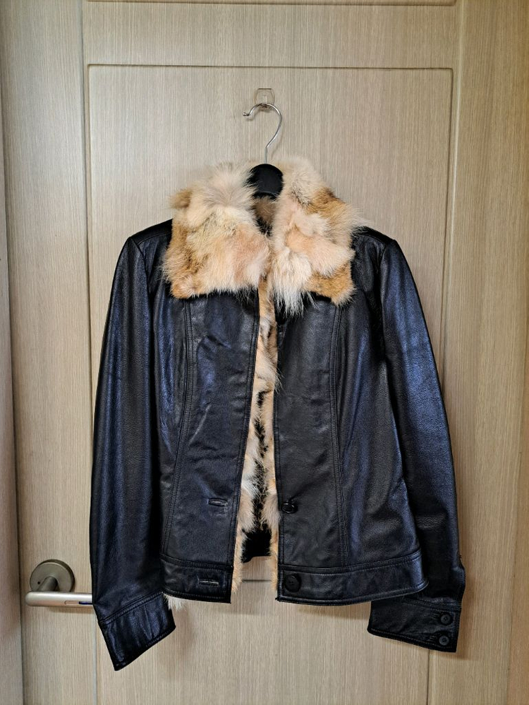 산양가죽 퍼 칼라 자켓 사이즈는 66이라고 되어 있는데 실착용 해보면 보통의 M 또는 55사이즈가 맞는것 같아요 단추가 하단 부분에 2개 있는데 단추를 잠그면 허리라인이 피트하게 예뻐요 실착 3-4회라 가죽 긁힘 거의 없고 아주 깨끗해요