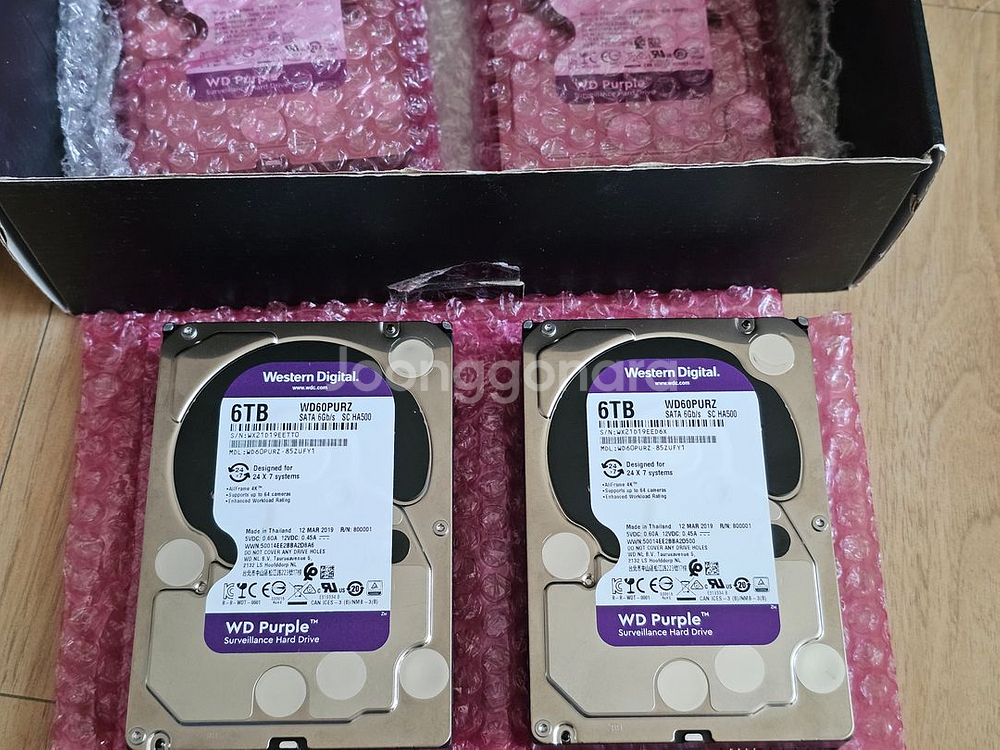 WD PURPLE 6TB HDD 판매합니다. WD60PURZ 사무실 모니터링서버용도로 1년정도 사용하였고, 이후에는 보관만 하던 하드입니다. crystalinfo 로 확인해보니 사용시간이 15,000~16,500 시간정도로 나오네요. 사용 1년정도에 추가로 전원만 켜둔상태로 1년정도 였던것 같습니다. 외관 깨끗하고 동작검사도 이상없이 나오며 AS기간은 지났습니다. 3개 있으며, 개당 14.5만 택포 안전거래입니다. 2개 28만 안전거