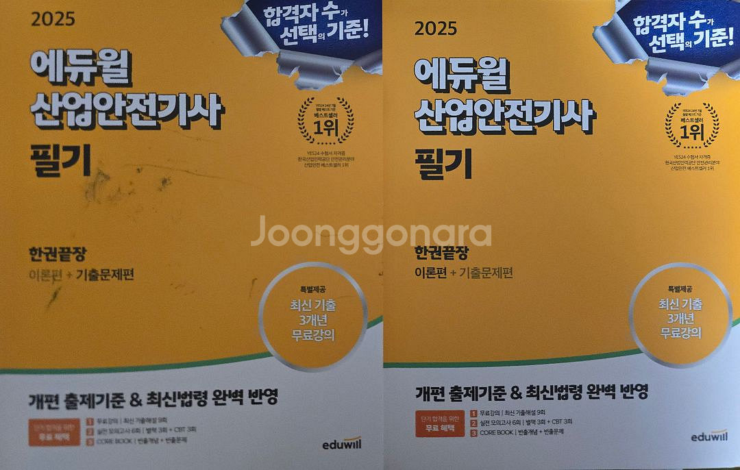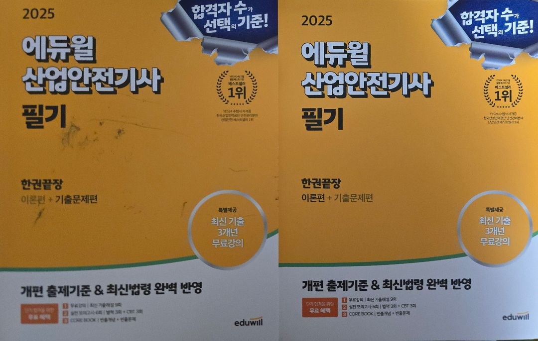 에듀윌 산업안전기사 필기 세트 이론서에는 초반 5페이지 정도 형광펜 흔적이 있어요 기출문제집엔 필기는 없지만 표지에 잉크자국이 조금 있습니다