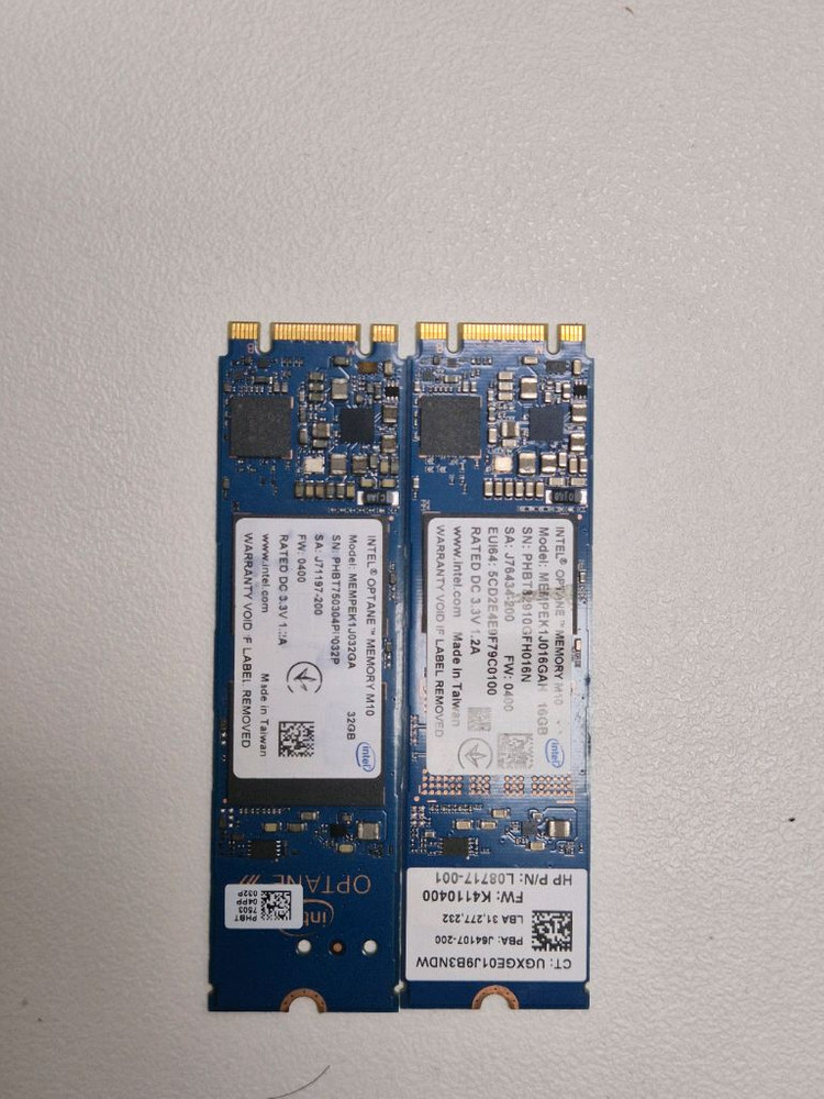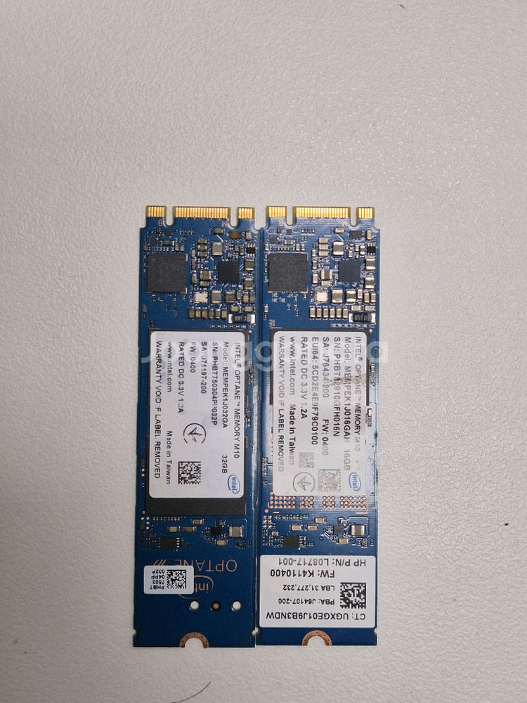 인텔 옵테인(optane) SSD 판매합니다. 32G + 16G 두 장 일괄로 판매합니다. 당산역 / 국회의사당역 근방 직거래 또는 반값택배 등 가능합니다.