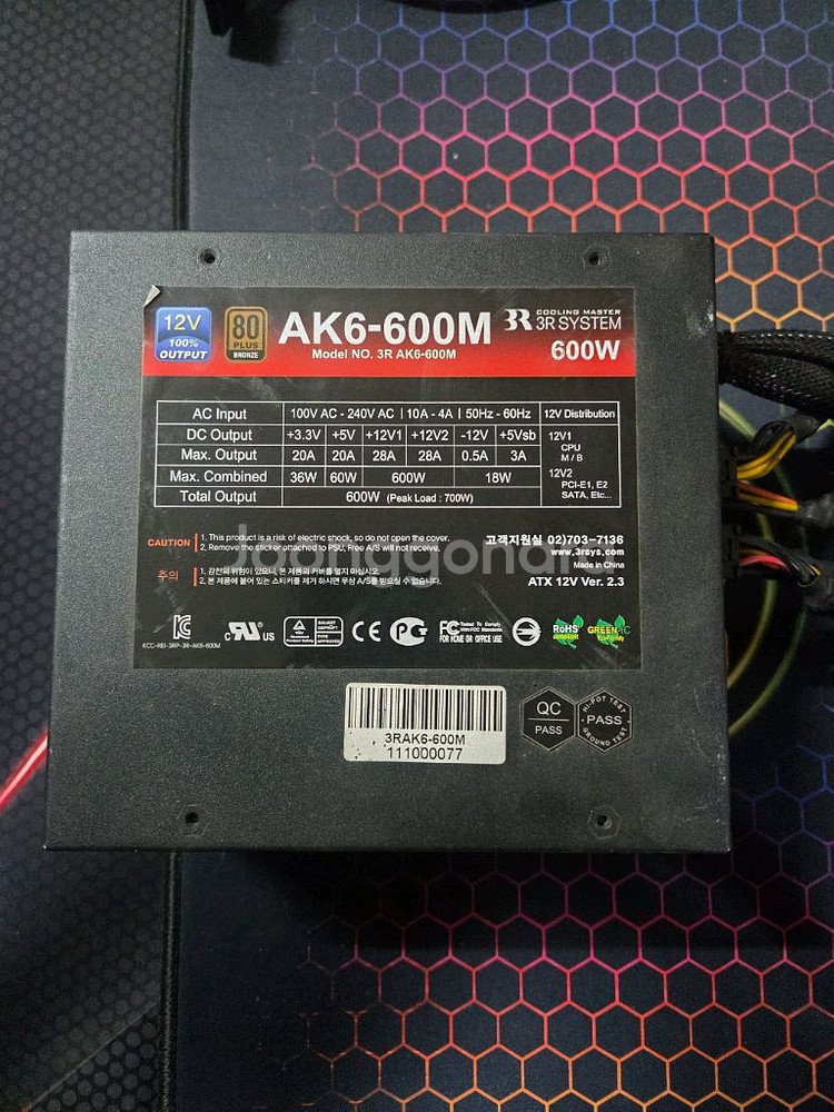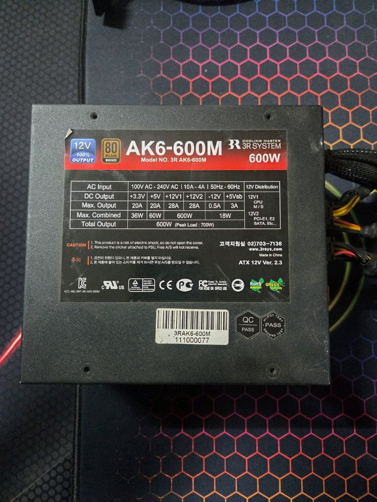 3RSYSTEM 600W 세미모듈 브론즈 파워서플라이 작동잘됩니다.